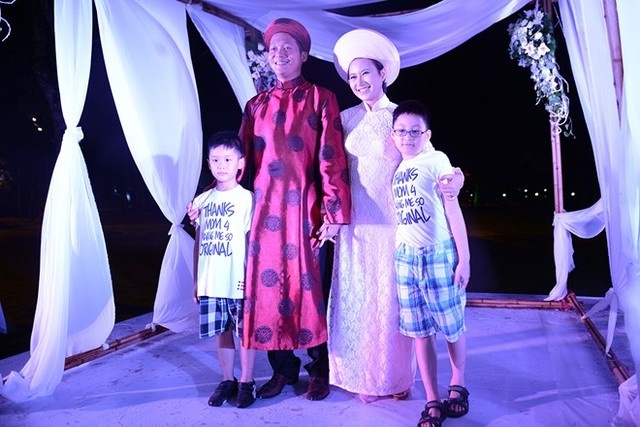 | Mới đây, nữ ca sĩ đươc mệnh danh là "họa mi nhạc Việt" kết hôn lần thứ 2. Chồng cô cũng có một cậu con trai riêng. Trong đám cưới, hai người con trai của họ lên sân khấu chúc mừng bố mẹ. |