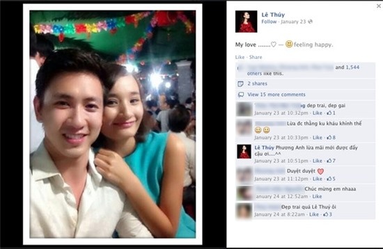 | Lê Thúy và Đức Anh quen nhau trong một chuyến công tác nước ngoài của chân dài. Họ mới yêu được khoảng 2 tháng. Tuy nhiên, ngần đó thời gian cũng đủ để Đức Anh làm quen và trở nên thân thiết với gia đình cũng như bạn bè của Lê Thúy. Hiện tại, chân dài trưởng thành từ cuộc thi Next Top Model vẫn chưa lên tiếng chính thức về bạn trai. Cô hứa hẹn khi "thiên thời, địa lợi, nhân hòa" sẽ chia sẻ thẳng thắn về chuyện yêu cùng người hâm mộ. |