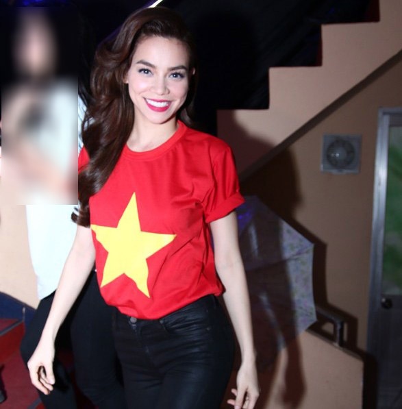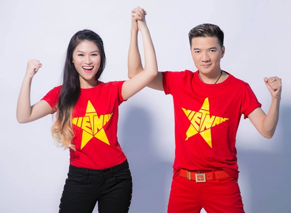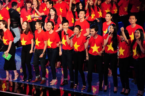 | Xuất hiện trong đêm trực tiếp đầu tiên của chương trình X Factor 2014, dàn sao Việt như Hồ Ngọc Hà, Cẩm Ly, Ông Cao Thắng, Nguyên Vũ, Khánh Ngọc... cùng Yến Trang - Hồ Vĩnh Khoa quyết định mặc áo đồng phục in hình cờ đỏ sao vàng. |