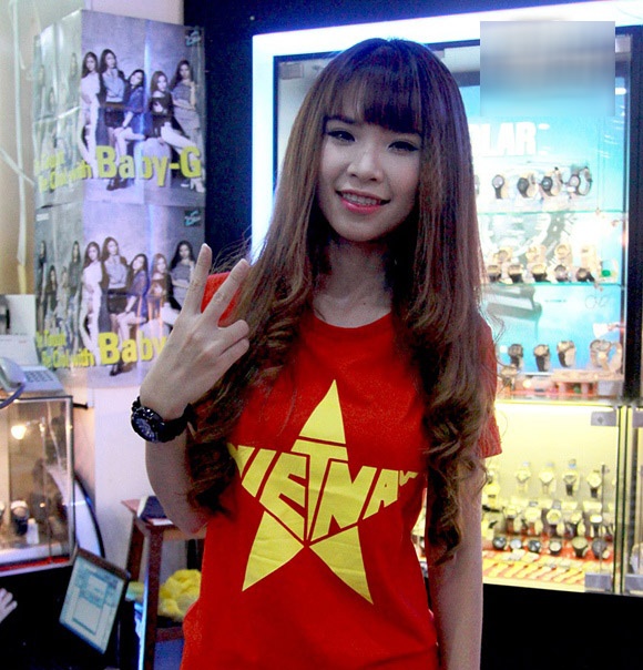 | Minh Hằng rạng rỡ trong chiếc áo pull lấy cảm hứng từ lá cờ Tổ quốc khi tham gia chương trình ca nhạc kêu gọi lòng yêu nước diễn ra hồi tháng 5/2014. |