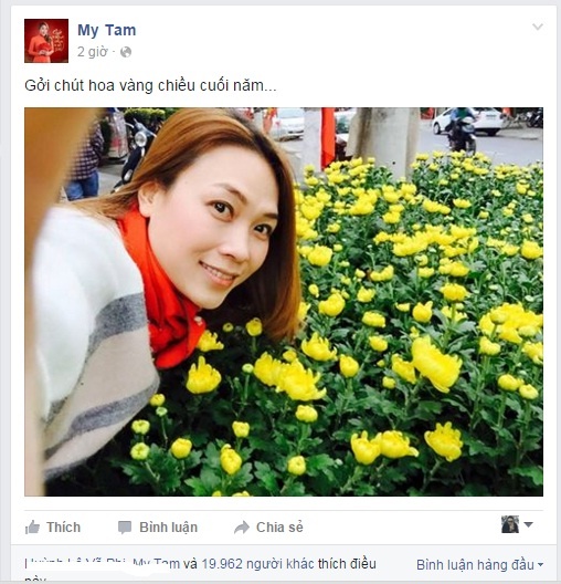 | Trang facebook của nữ ca sĩ Mỹ Tâm chia sẻ bức ảnh chụp bên những bông hoa cúc vàng với khuôn mặt rạng rỡ. Nữ ca sĩ viết: "