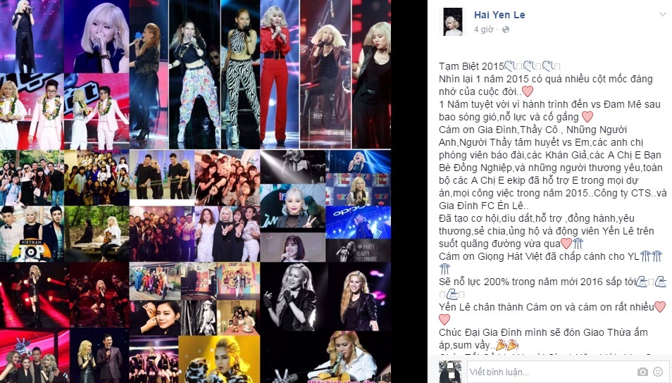 Yến Lê, học trò xuất sắc nhất của Tuấn Hưng tại Giọng hát Việt 2015 tổng kết lại năm cũ bằng dòng chia sẻ khá dài . Cô dành lơi chúc đến mọi người: "Chúc tất cả mọi người đón năm mới vạn sự thành công, sức khỏe, may mắn, phán tài phát lộc, vạn sự như ý. Đón năm mới Bính Thân sum vầy ấm áp bên người thân và gia đình". |