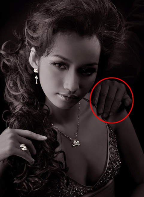 | Hoa hậu Jennifer Phạm thì may mắn hơn. Cô không bị "mất tay" hoặc "thừa tay" mà chỉ là bị teo tay, tất cả cũng chỉ vì photoshop. |