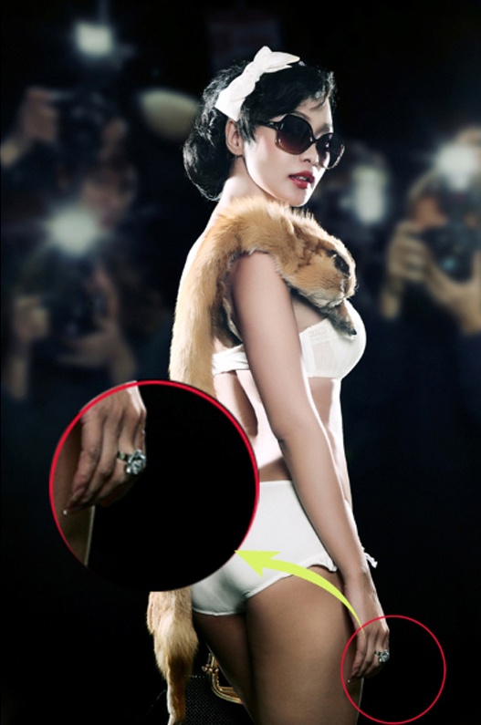 | Siêu mẫu Võ Hoàng Yến cũng trở thành nạn nhân của photoshop. Để biến cô thành "quả bom sex", người làm ảnh đã quá tay khi biến vòng 1 của cô trở nên to quá mức. |