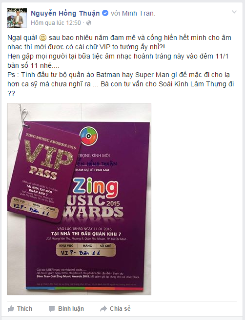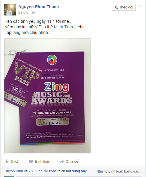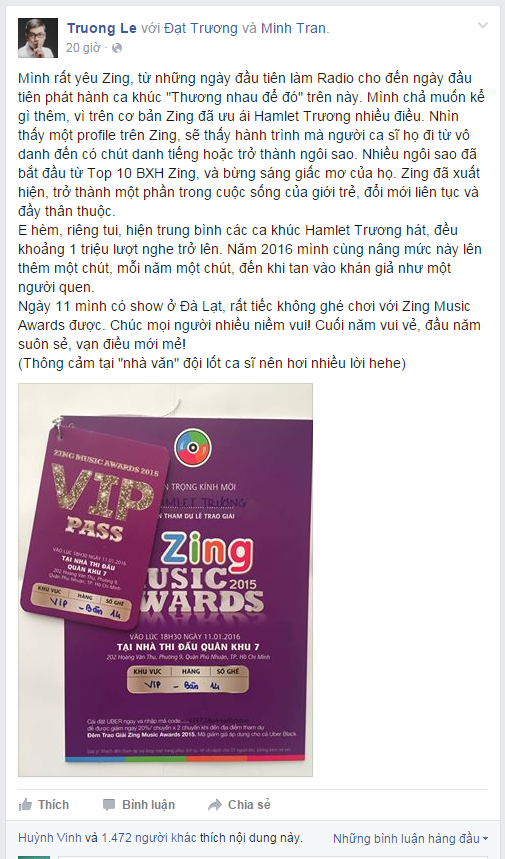 Tác giả Hamlet Trương cũng dành sự yêu mến cho giải thưởng âm nhạc trực tuyến đầu tiên của Việt Nam. Mặc dù không tham dự đêm Gala nhưng anh cũng kêu gọi mọi người chờ đón sự kiện âm nhạc hoành tráng này. |