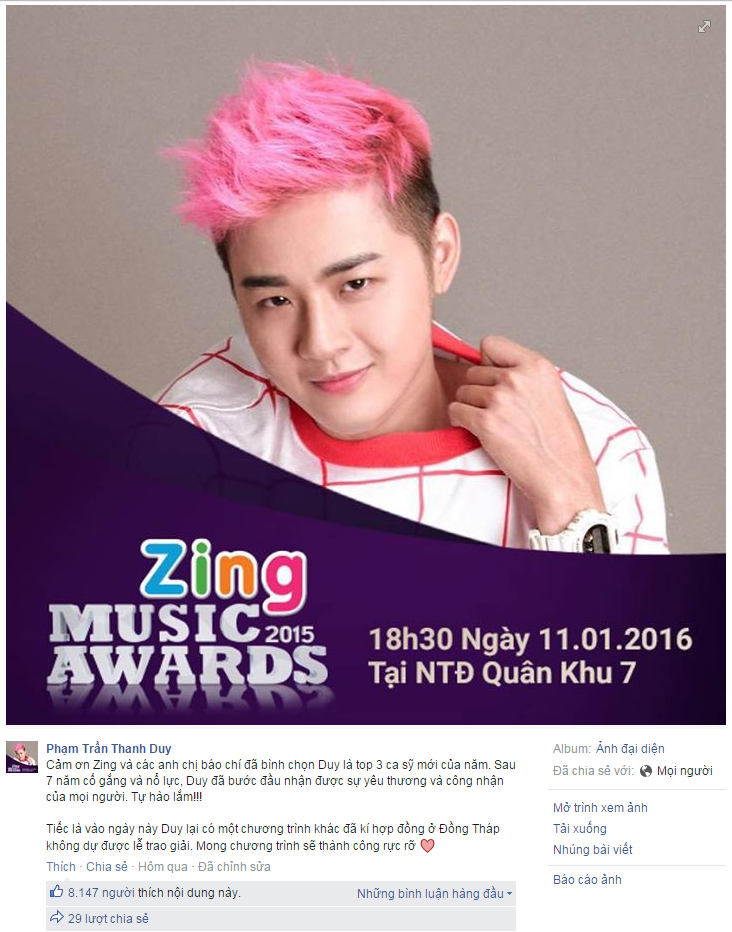 Thanh Duy có mặt tại Top 3 Nghệ sĩ mới của năm cùng Tiên Tiên, Isaac và Ái Phương (vì có cùng số phiếu). Năm 2015, giọng ca Tonight có nhiều hoạt động nổi bật, đăng quang Gương mặt thân quen mùa 3 và tung ra nhiều sản phẩm chất lượng. Sau 7 năm nỗ lực, anh đã có chỗ đứng vững chắc trên thị trường. Nam ca sĩ không giấu hy vọng nhận được giải thưởng từ ZMA. |