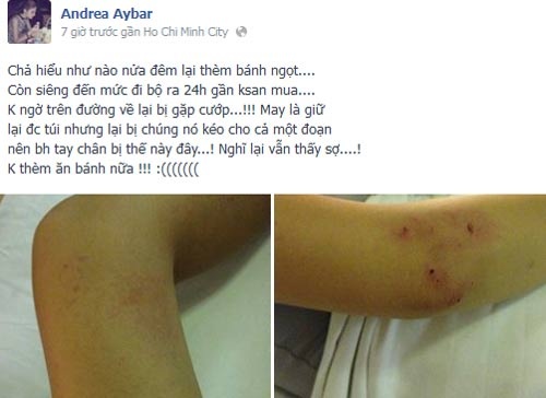 Đằng sau những tấm hình chụp lại hậu quả của vụ bị cướp kéo lê trên phố, Andrea kể lại vụ việc: "Chả hiểu như nào nửa đêm lại thèm bánh ngọt, còn siêng đến mức đi bộ ra gần khách sạn mua. Không ngờ trên đường về lại bị gặp cướp. May là giữ lại được túi nhưng lại bị chúng nó kéo cho cả một đoạn nên bây giờ tay chân bị thế này đây! Nghĩ lại vẫn thấy sợ".