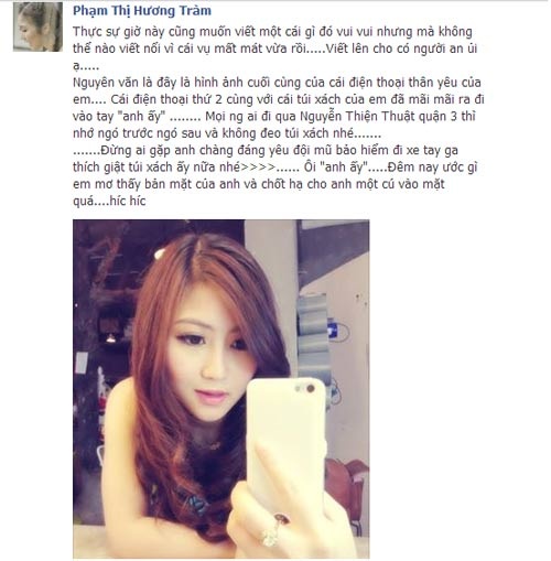 Hồi đầu tháng 7, Hương Tràm cũng chia sẻ chuyện chẳng may với bản thân khi bị giật mất điện thoại khi đang đi trên đường. Đây là lần thứ 2 cô bị mất điện thoại trong năm 2013.