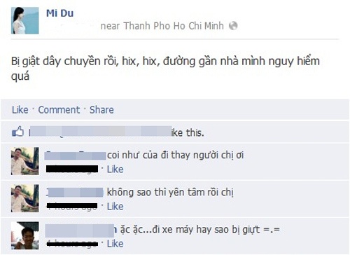 | Midu kêu trên trang cá nhân vụ bị giật dây chuyền trên phố. |