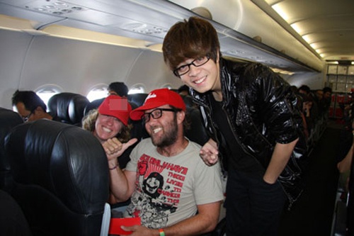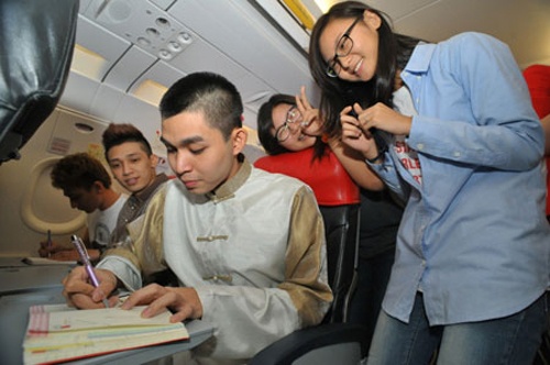 | Sự xuất hiện của sao Việt trên máy bay chính là cơ hội để fan tiếp cận thần tượng dễ dàng nhất. Các thành viên của nhóm 365 không ít lần nhận được lời đề nghị chụp hình chung hay ký tặng trong các chuyến bay dài. |