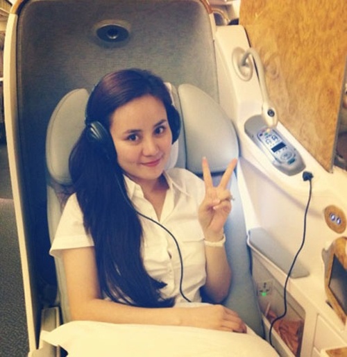 | Thu Minh cũng từng khoe ảnh nằm thảnh thơi thưởng thức sâm-panh khi ngồi khoang thương gia của một chuyến bay. |