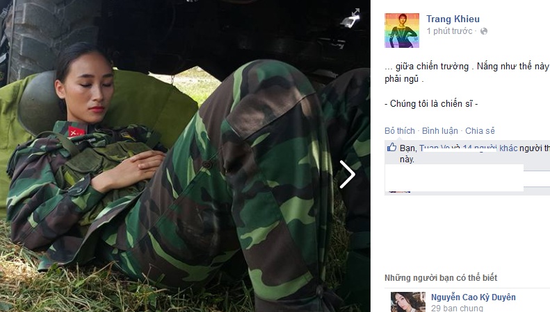 Trên trang cá nhân, Trang Khiếu đăng tải hình cô mặc quân phục, say sưa ngủ dưới gầm xe tải kèm chú thích: "Giữa chiến trường. Nắng như thế này thì giặc cũng phải ngủ. Chúng tôi là chiến sĩ". Người hâm mộ khen ngợi, trông cô rất xinh đẹp khi "ngủ bụi".