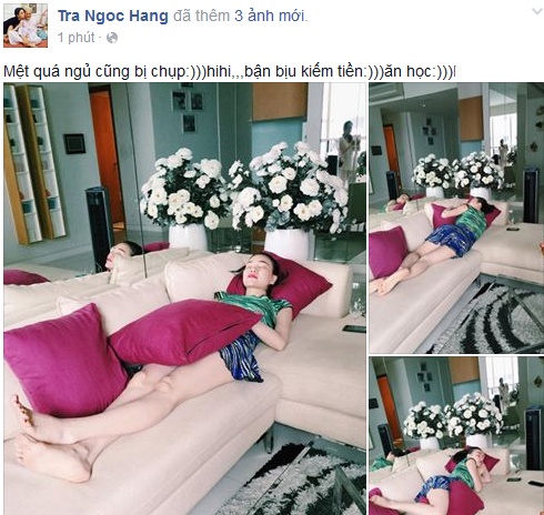 | Trên trang cá nhân, Trà Ngọc Hằng tâm sự, công việc bận rộn khiến cô ngủ gục lúc nào không hay mỗi khi trở về nhà. Người đẹp còn hài hước trách người chụp ảnh: "Bận bịu kiếm tiền ăn học. Mệt quá ngủ cũng bị chụp hình". |