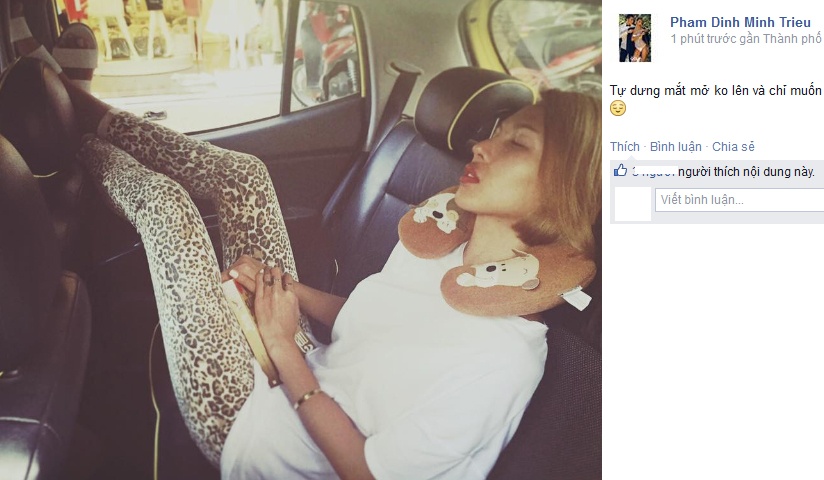 | Chung hoàn cảnh với đồng nghiệp, Minh Triệu cũng có những khoảnh khắc ngủ say không mấy đẹp đẽ khi ngồi ôtô về nhà sau những buổi chụp hình ngoại cảnh vất vả. "Tự dưng mắt mở không ra và chỉ muốn lăn ra ngủ dù biết không đẹp trong lúc say giấc nồng", người đẹp viết. |