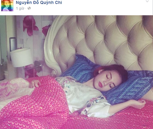 | Quỳnh Chi đăng tấm ảnh cô "say giấc" trong trạng thái không tẩy trang. MC - ca sĩ cho biết, do chạy show đến tối khuya nên cô sẽ ngủ ngay khi vừa về đến nhà. Việc quên tẩy trang diễn ra thường xuyên. Thậm chí, có khi cô còn thức dậy lúc nửa đêm để rửa mặt và ăn bữa nhẹ lót dạ. |