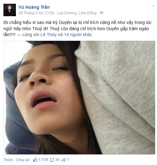 | Riêng hot girl Thủy Top, cô bị bạn bè "bóc mẽ" khoảnh khắc xấu khi đang ngủ để bênh vực Hoa hậu Kỳ Duyên. Bức ảnh "ngủ xấu" của thí sinh Tuyệt đỉnh tranh tài thu hút hơn 1.500 lượt bấm yêu thích. |