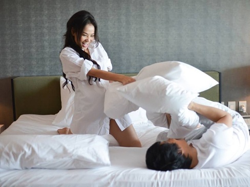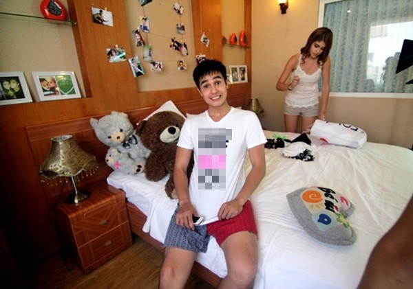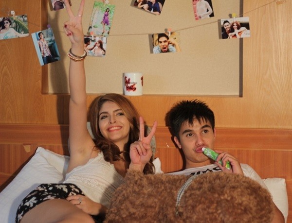 | Thu Minh mặc độc một chiếc áo sơ-mi trắng đùa giỡn với Thanh Bùi trên giường ngủ trong MV. |