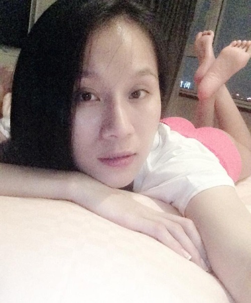 | Hồng Quế khoe... rốn khi tạo dáng trên giường. |