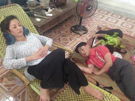 | Thúy Nga - Don Nguyễn diện nguyên quần áo lúc diễn xuất để tranh thủ chợp mắt ở trường quay. |