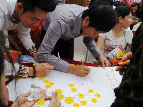 | Từ đó, cứ mỗi năm, khi Tết đến xuân về, các văn nghệ sĩ và người dân tại TP.HCM lại cùng nhau chuyển những tình cảm đến những ai đang làm việc trên đảo xa bằng tấm thiệp xuân lớn cùng các món quà do chính họ gói. |