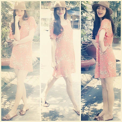 Hồ Ngọc Hà lựa chọn đôi dép lê đính hoa khá nữ tính, dịu dàng khi diện chiếc váy màu cam may từ chất liệu vài mềm. Cách kết hợp này thu hút sự chú ý của nhiều bạn trẻ mê thời trang. Ảnh: FBNV