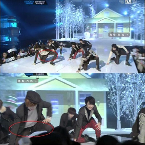 | Trong phần trình diễn ca khúc I’ll Be There, thành viên Min Woo của nhóm nhạc Boy Friend đã vướng phải một sự cố gây chú ý. Khi thực hiện động tác quỳ gối và di chuyển chân, không may, Min Woo đã bị rách quần đúng phần… nhạy cảm. |