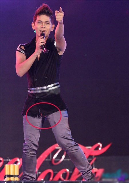 | Cũng với nguyên do nhảy quá sung, Sơn Ngọc Minh, thành viên nhóm V.Music cũng bị chính chiếc quần của mình phản bội khi tham dự H2T Concert diễn ra tối 21/5/2011. |
