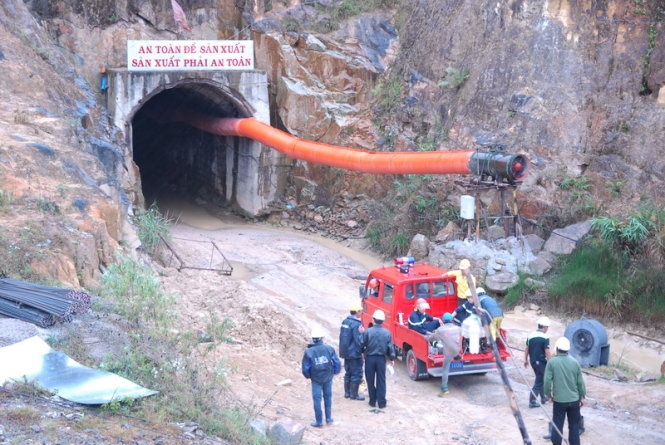 | Công trình này gồm hai nhà máy thuỷ điện liên hoàn - Nhà máy thuỷ điện Đa Dâng đặt trên dòng sông Đa Dâng (xã Lát, huyện Lạc Dương) và Nhà máy thuỷ điện Đa Chomo trên suối Đa Chomo (nhánh của sông Đa Dâng, tại xã Phi Tô, Lâm Hà). Ảnh: Lực lượng cứu hộ tìm cách vào bên trong đường hầm. |