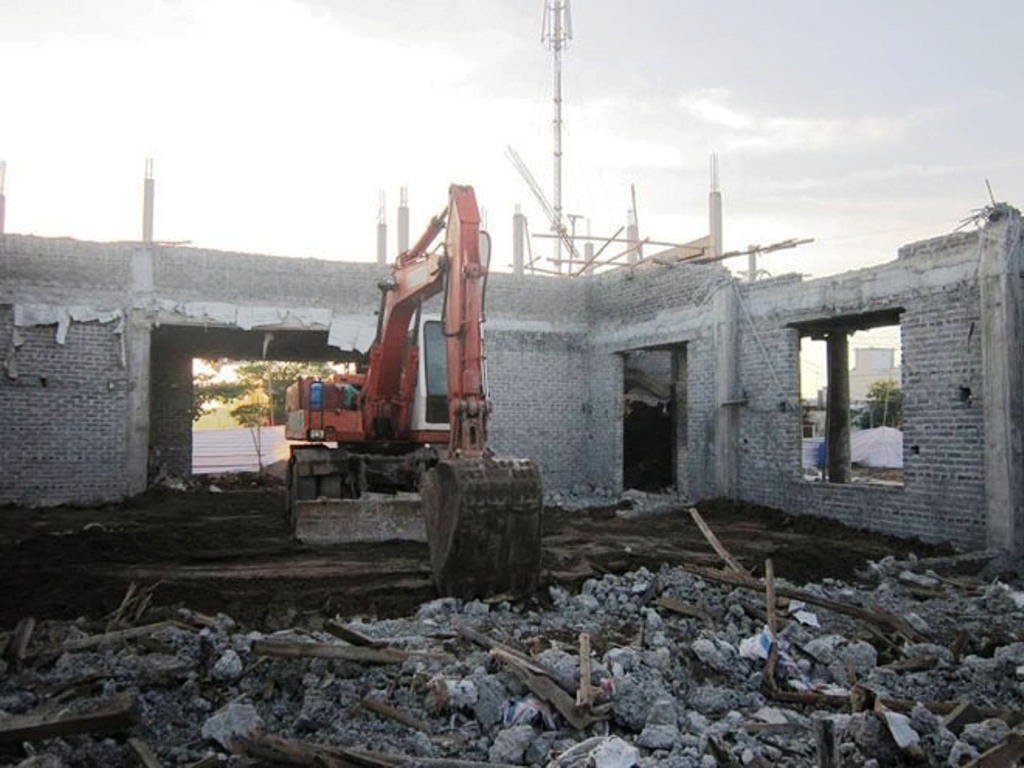 | Bê tông đã “chết” nên công nhân phải dùng máy xúc đập vỡ thành các mảng bê tông nhỏ để lấy sắt thép và xúc bê tông, gỗ ra ngoài. |