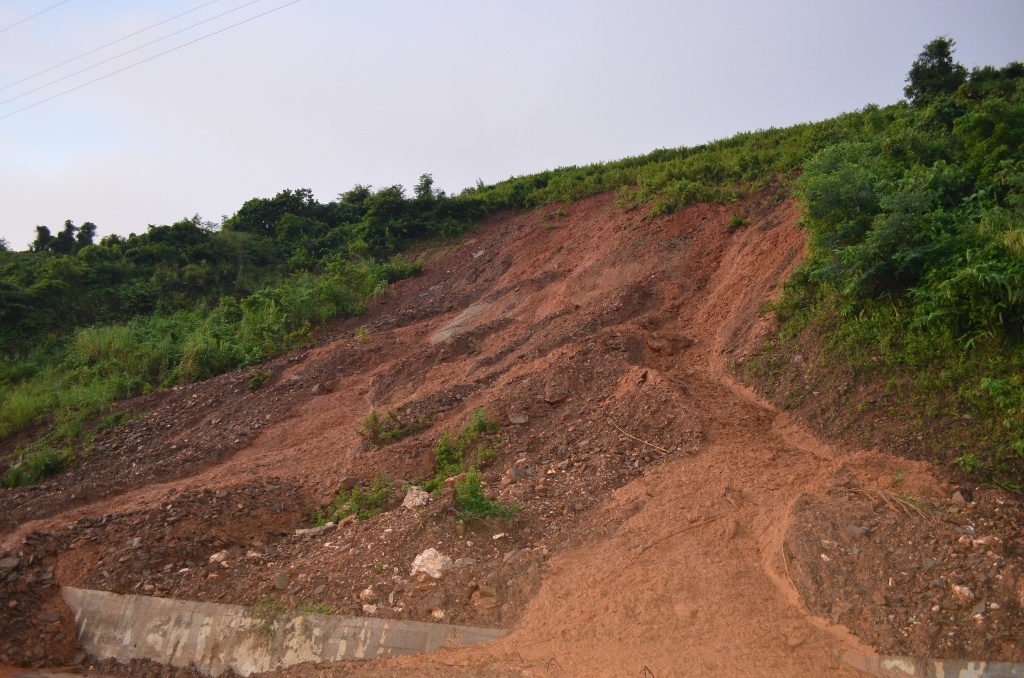 | Một lượng bùn đất từ trên đỉnh núi sạt ngang đường, đổ xuống sông Nậm Mộ, người và xe không thể qua lại. |