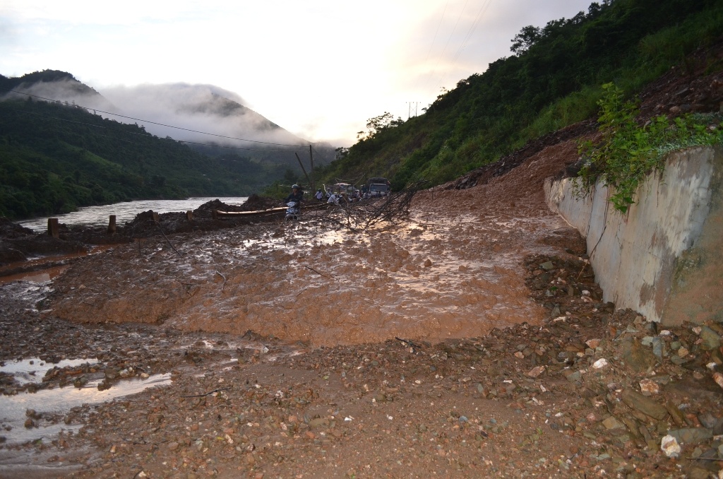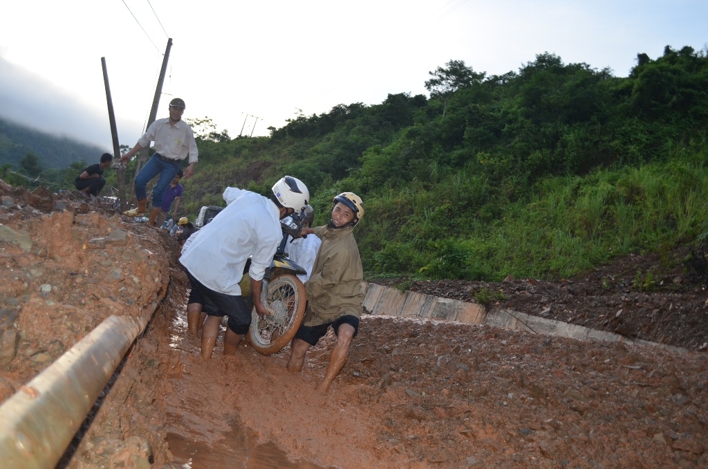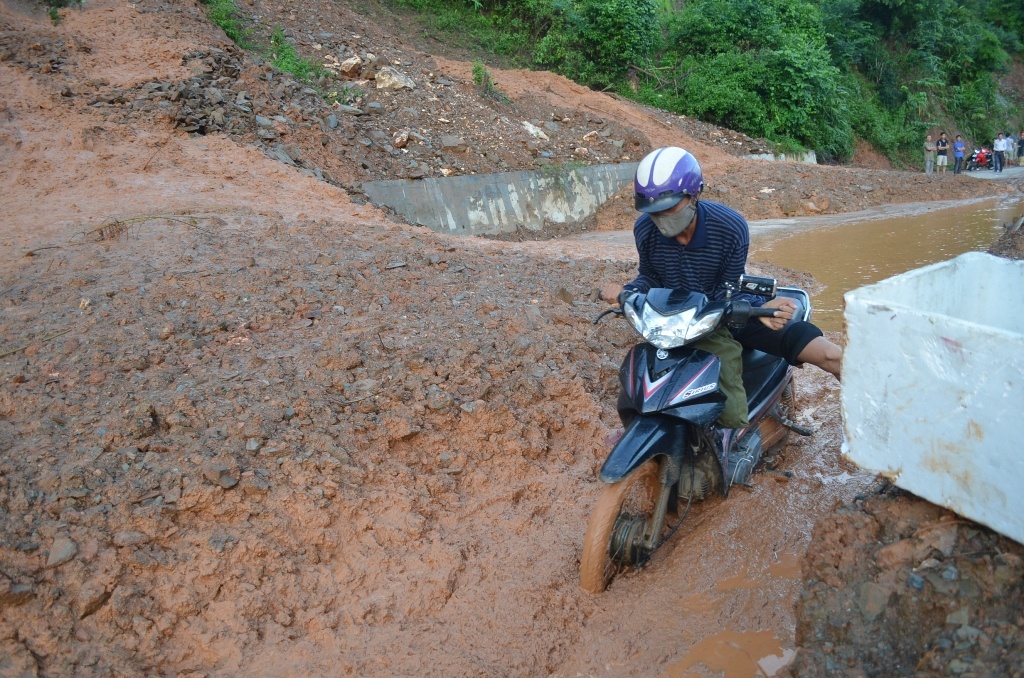 Sạt lở, người dân lội bùn khiêng xe qua quốc lộ