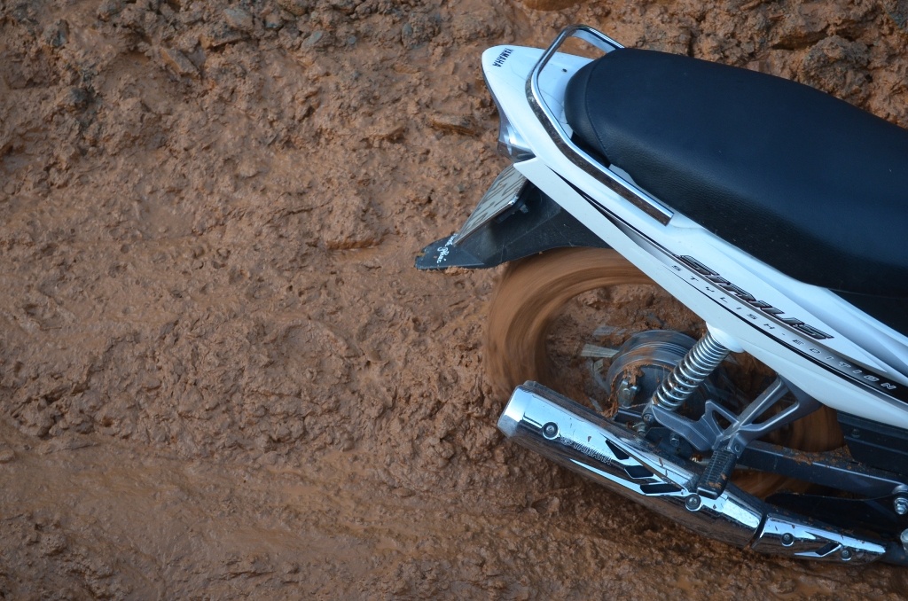 | Chiếc bánh sau của xe máy bị ngập sâu trong bùn đất. |