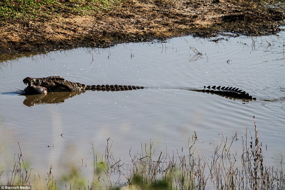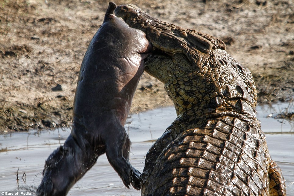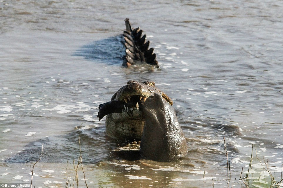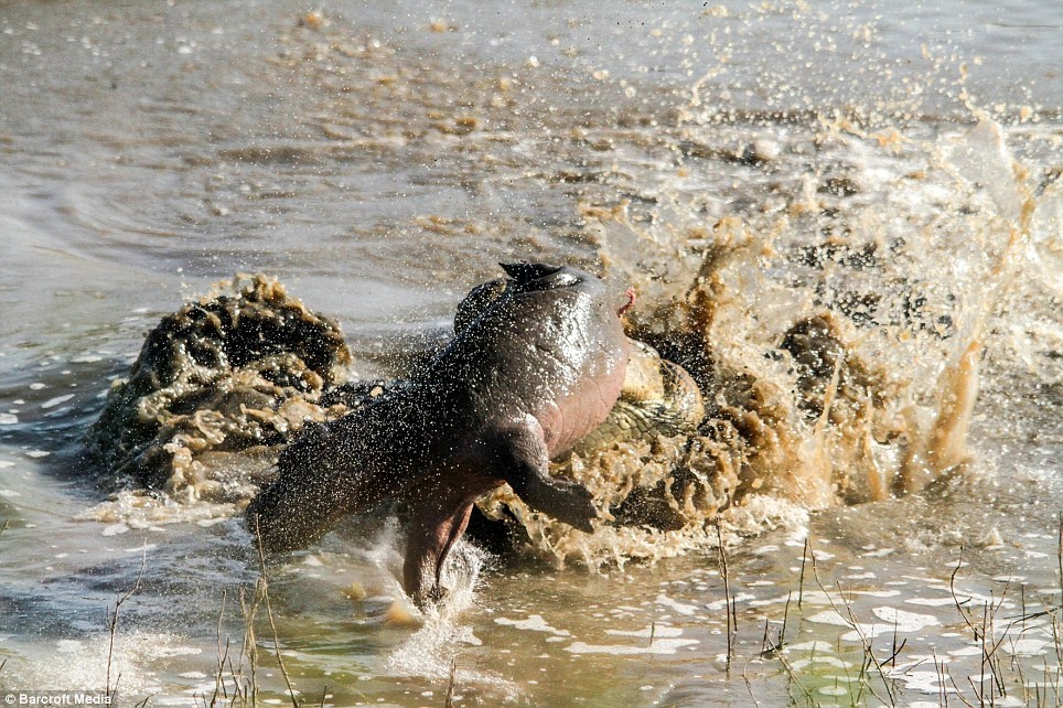 Nước bắn tung tóe khi con cá sấu khổng lồ sung sướng vui đùa với con hà mã không may mắn như nghịch một món đồ chơi.