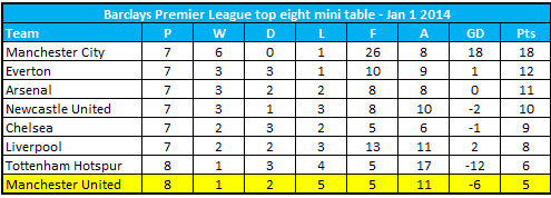 Đầu năm 2014, MU tiếp tục gây thất vọng khi để thua Tottenham với tỷ số 1-2 ngay trên sân nhà Old Trafford ở vòng 20 Ngoại hạng Anh. Sau khi đánh rơi 3 điểm trước đội bóng thành London, Quỷ đỏ đã mất tới 26 điểm tính đến thời điểm hiện tại mùa này. Ngay đầu năm mới 2014, MU đã bị đẩy xuống vị trí thứ 7 và kém 5 điểm so với top 4. Kết quả thi đấu của CLB chủ sân Old Trafford mùa này thực sự rất đáng thất vọng.