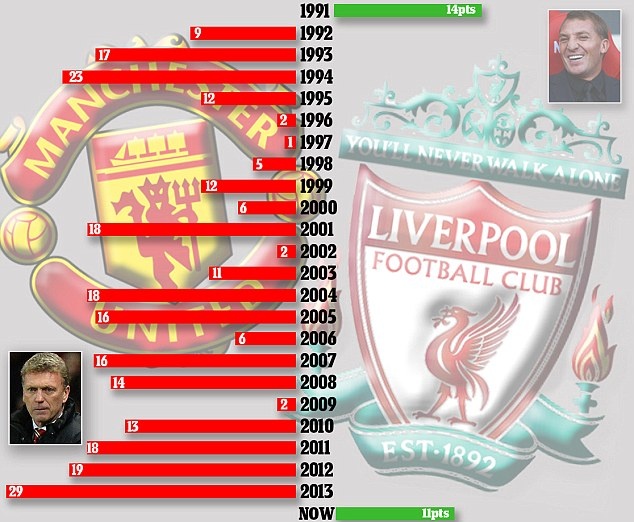 Tất cả đã đảo chiều ở mùa giải này khi M.U đã không còn là chính họ chỉ sau 1 năm với sự dẫn dắt của David Moyes, còn cán cân quyền lực lại đang nghiêng về thành phố cảng nước Anh. Cùng thời điểm trước Lễ tình nhân năm ngoái, M.U hơn Liverpool tới 29 điểm. Còn hiện tại? The Kop đã cho M.U ngửi khói với khoảng cách 11 điểm sau chiến thắng ngược dòng Fulham mới đây. Tức chỉ trong vòng 12 tháng qua, Liverpool đã kiếm được nhiều hơn M.U tới 40 điểm.