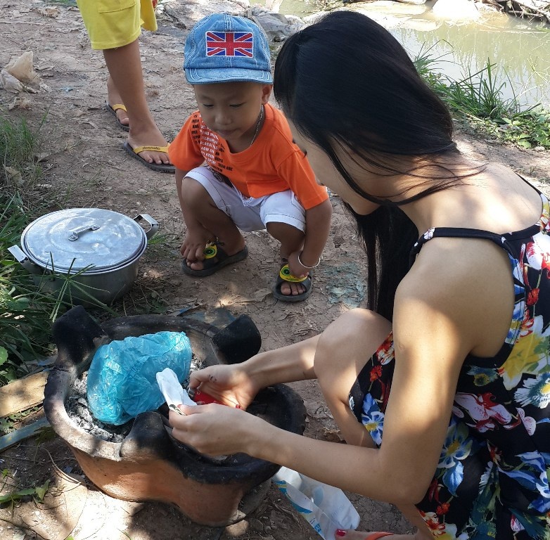 | Buổi sáng, sau khi ra ruộng dạo chơi, chụp hình với các cháu, Oxy trở về nhà lo bữa cơm trưa cho gia đình.