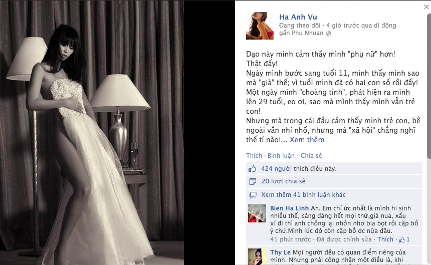 Với những dòng tâm trạng của Mỹ Linh, cư dân mạng nhớ đến trải lòng của Hà Anh cách đây không lâu cũng về phụ nữ: "Bản năng của chúng ta như vậy, hay chúng ta không đủ tự tin để đi tìm hạnh phúc cho chính mình mà tạm hài lòng với những cái hiện tại, có sẵn, những suy nghĩ cũ kỹ dù có khi nó làm cho chúng ta trở nên bất hạnh? Thường có con rồi, mọi thú vui riêng, những chăm sóc cá nhân nho nhỏ như làm đẹp, hay chưa kể đến phát triển đam mê hay thăng tiến trong công việc đều trơ thành dĩ vãng, hay giấc mơ ngọt ngào!".