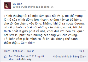 Những lời của Mỹ Linh dành cho các con cũng khiến nhiều người mẹ bận rộn cảm thấy mình cần dừng lại một phút để suy ngẫm nhiều hơn: "Tôi luôn cảm giác mình có lỗi khi đã không thể dành thêm thật nhiều thời gian chăm sóc cho gia đình và các con mỗi ngày. Bao nhiêu cũng không thấy là đủ, khi thời gian thực sự rất khó thu xếp. Sân khấu, phòng thu, học trò, các hoạt động xã hội, thời gian tập luyện... những không gian của tôi đều nằm ngoài gia đình, mà con cái đã lớn dần lên. Tôi đã từng nghĩ liệu mình có phải là một bà mẹ tốt? Ở mức độ tốt nhất mà tôi có thể? So với tình yêu tôi có?".