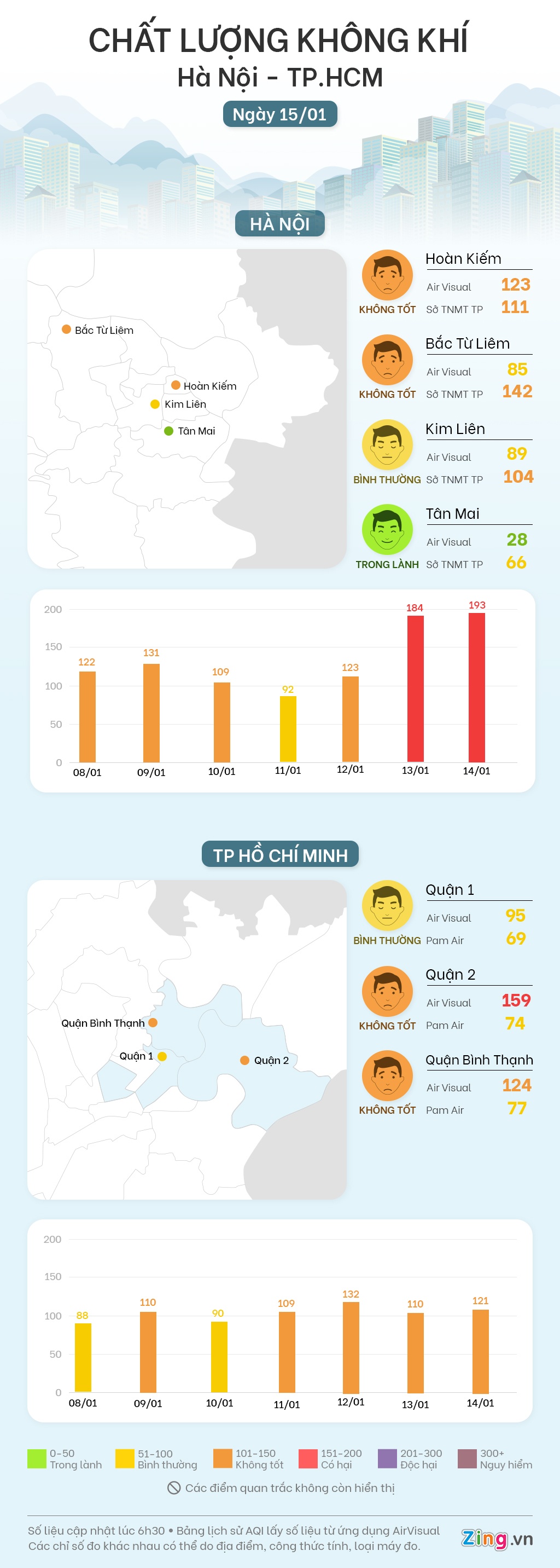Sau ngày ô nhiễm top đầu thế giới, sáng 15/1, không khí Hà Nội được cải thiện, có nơi chỉ số AQI ở ngưỡng trong lành. TP.HCM không khí vẫn ở ngưỡng trung bình.
