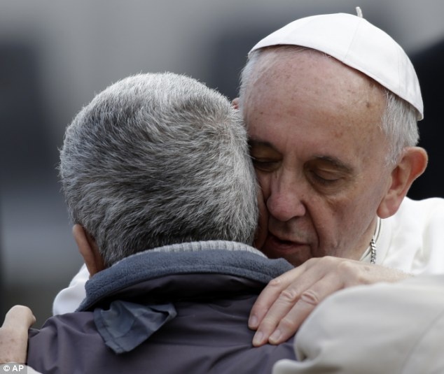 | Đức Giáo hoàng ôm hôn, cầu phước cho người đàn ông không mặt. Ảnh: Dailymail. |