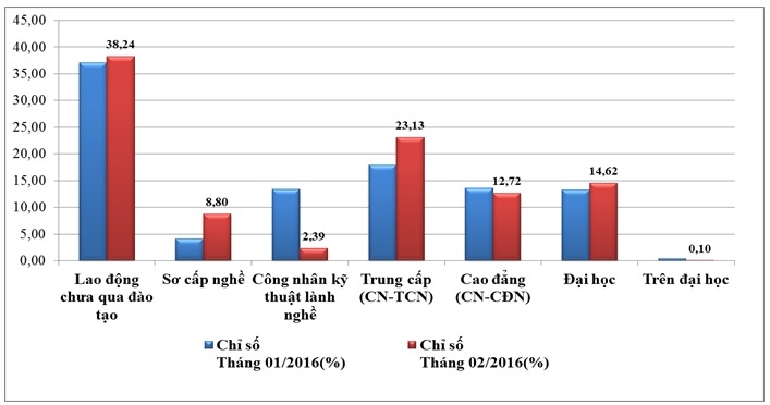 Trong tháng 2/2016, nhu cầu tuyển dụng lao động chưa qua đào tạo chiếm đến 38,24%. Nguồn: Trung tâm dự báo nguồn nhân lực TP HCM. |