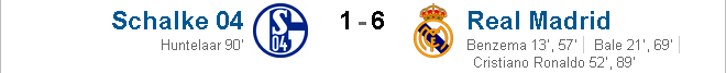13': Ronaldo có pha đánh gót kiến tạo kỹ thuật cho Bale xâm nhập vòng cấm, nhưng trong nỗ lực phá bóng, hậu vệ Schalke vô tình giúp Benzema có cơ hội dứt điểm dễ dàng, mở tỷ số trận đấu.