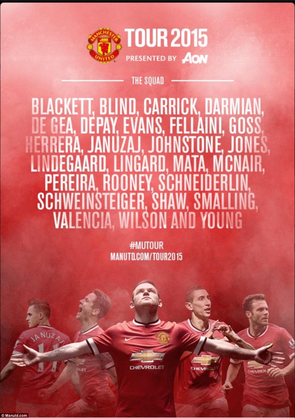 | Danh sách 26 cầu thủ M.U du đấu hè 2015. Tại xứ sở cờ hoa, "bầy Quỷ đỏ" lần lượt gặp các đối thủ Club America (ngày 18/7, Seattle), San Jose Earthquakes (ngày 22/7, Berkeley), Barcelona (ngày 25/7, California) và Paris Saint-Germain (ngày 30/7, Chicago). |