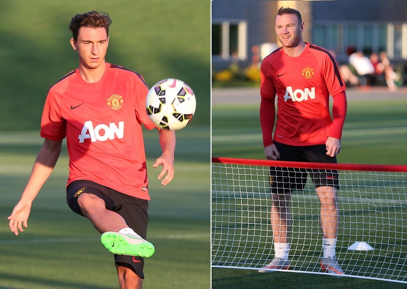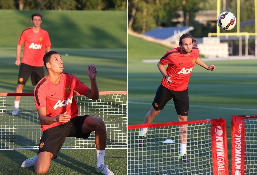| Hai hậu vệ Chris Smalling (trái) và Darley Blind tập nhẹ nhằm tìm lại cảm giác bóng sau thời gian dài nghỉ hè. Buổi tập diễn ra với bầu không khí vui vẻ và thoải mái. |