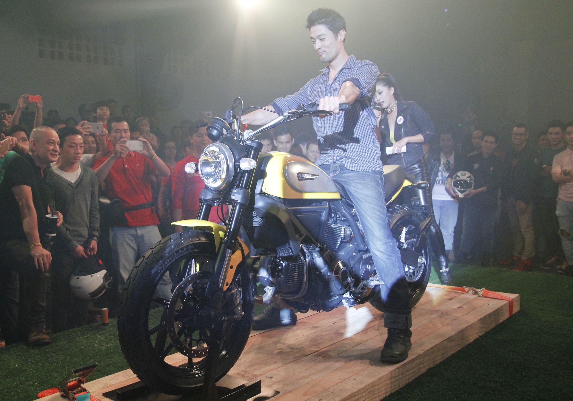 | Diễn viên Johnny Trí Nguyễn ngồi thử chiếc Scambler đầu tiên tại Việt Nam. |