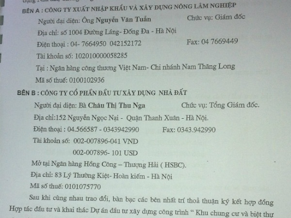 Theo thảo thuận này, nếu công ty xuất nhập khẩu và xây dựng Nông lâm nghiệp cần kinh phí để giải quyết các vấn đề liên quan đến thuế và hoạt động sản xuất kinh doanh, thì bên Housing sẽ tạo điều kiện ứng trước. Phần kinh phí này được đối trừ và hạch toán vào dự án, đồng thời bên Công ty Xuất nhập khẩu và Xây dựng Nông lâm nghiệp phải trả lãi vay cho phần kinh phí ứng trước đó. Vai trò của công ty trách nhiệm hữu hạn xuất nhập khẩu và đầu tư xây dựng phát triển Hà Nội là đơn vị chủ đầu tư góp đất để thực hiện dự án và cung cấp hồ sơ thủ tục pháp lý có liên quan đến khu đất trên.