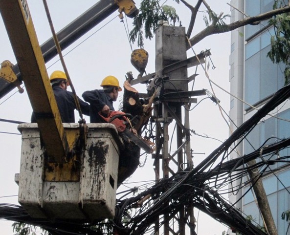 | Công nhân công ty cây xanh xử lý sự cố ngã cây trong điều kiện ngập nước, mưa gió. |