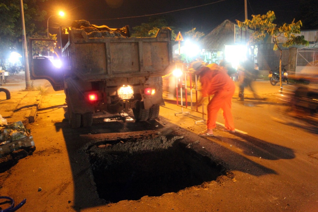 | Công nhân công ty thoát nước làm việc bất kể ngày đêm. |