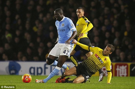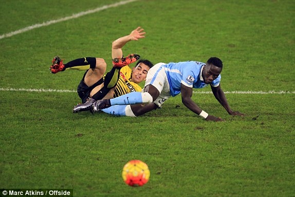 | Almen Abdi bị trọng tài thổi phạt sau tình huống vào bóng quyết liệt quá mức cần thiết đối với Yaya Toure của Man City. |