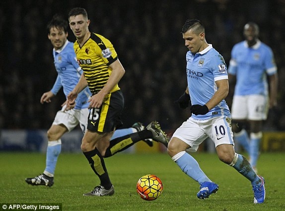 | Sergio Aguero nỗ lực đi bóng trước hàng phòng ngự được tổ chức tốt và khá đông cầu thủ Watford tập trung ở phần sân nhà. |